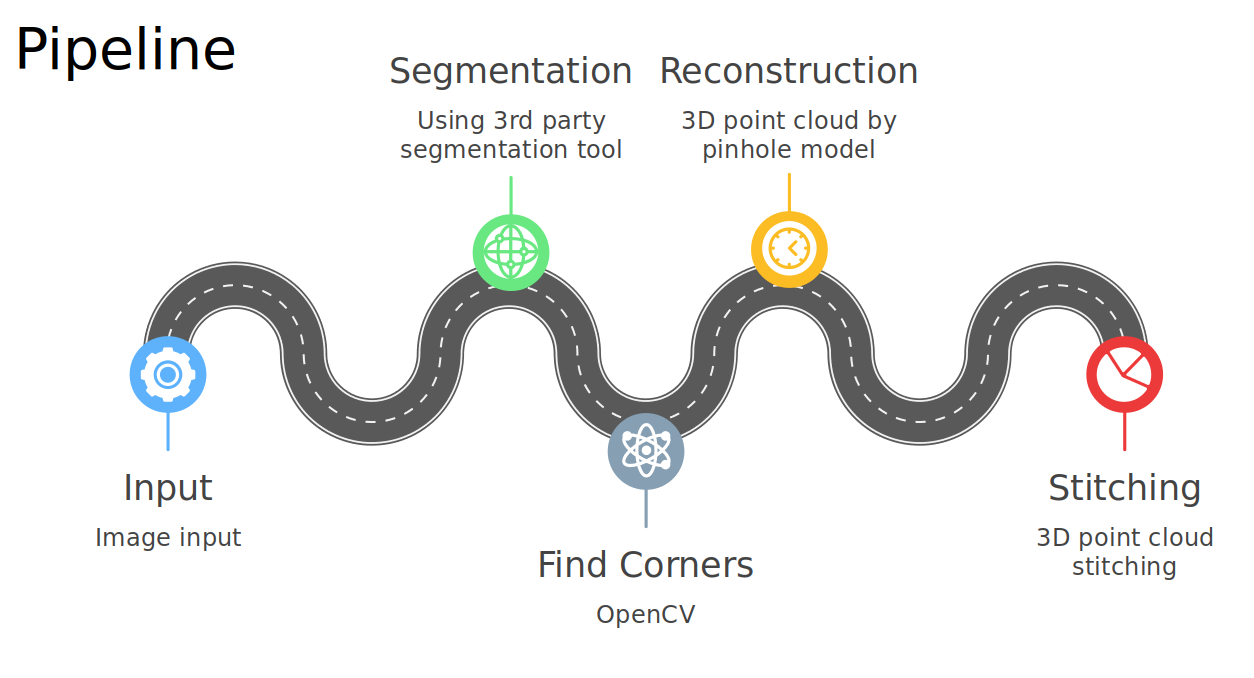 Video Input: The video input obtained from the four cameras (with time stamp) Image Preprocessing: From the video frames, we extracted road marker bounding boxes. Segmentation: Isolate the road marker corner points within the bounding boxes. Road Marker Corner Points: Find the detected corner points for reconstruction. 3D Reconstruction: Utilizing the pinhole model, we reconstructed the 3D representation of the road markers. Road Marker 3D Point Cloud: We concat pointcloud of 4 consecutive frames to get denser pointcloud.