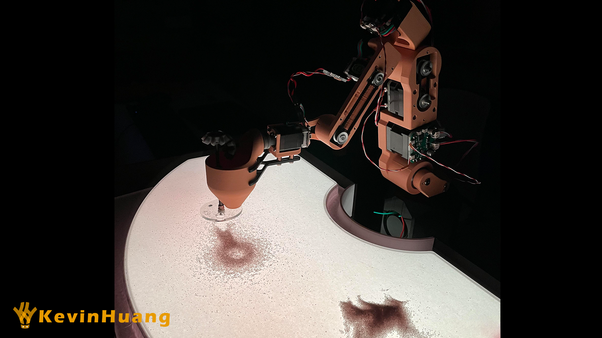 The sprinkler end-effector emulates the hand gesture of an artist while sprinkling sand. It offers the ability to adjust the size of the opening between the fingers, allowing control over the flow speed and the quantity of sand being applied. Various mechanisms, including an iris door, were considered, but mechanical limitations led to leakage issues. To achieve both functionality and simplicity, a two-hole plate and a time hourglass-shaped cup mechanism were adopted. The last degree of freedom of the wrist manipulates the sprinkler.